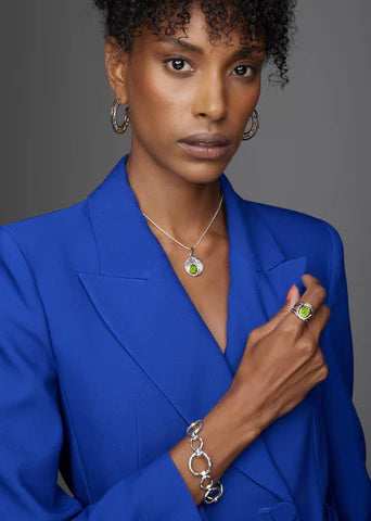 Maya Earrings in Sterling Silver & Gold Vermeil Celeste Pendant in Peridot Jasmine Ring in Peridot Sea Honey Bracelet in Sterling Silver